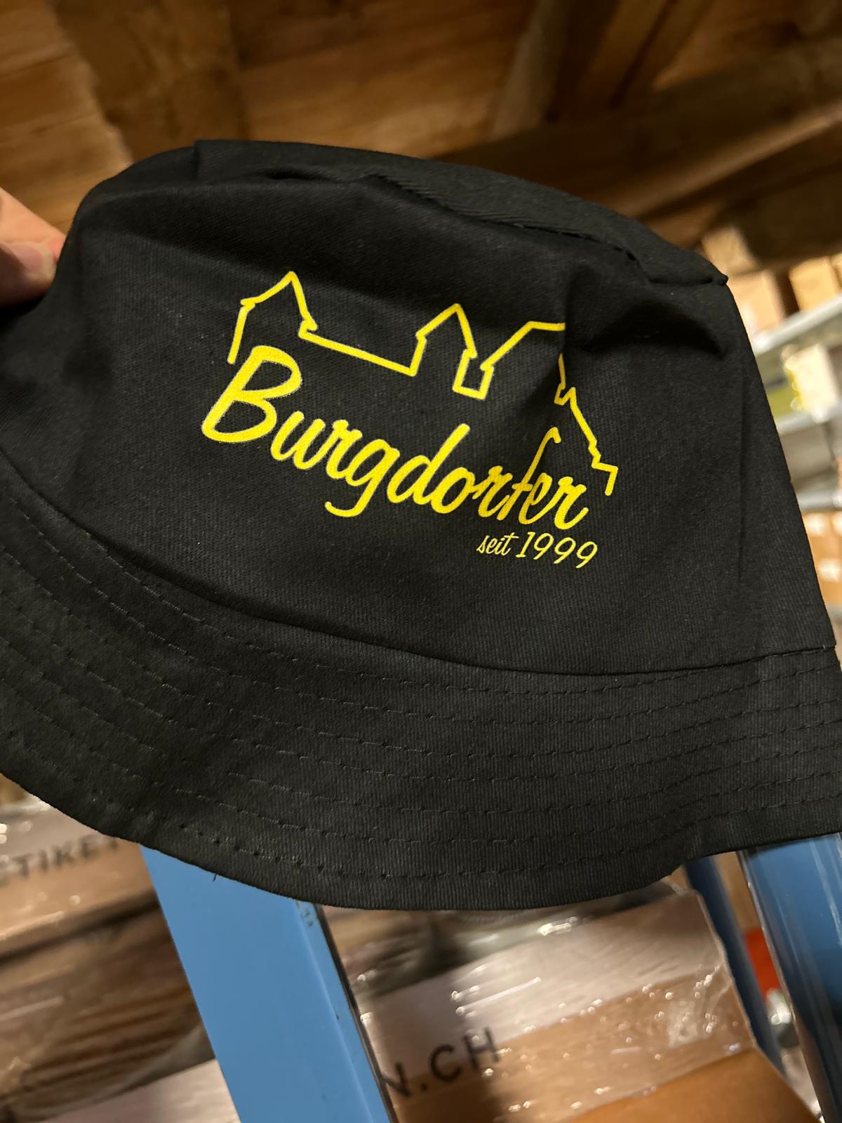 Fischerhut aus 100% Baumwolle mit gelbem Burgdorfer Logo-Druck "Silhouette" auf der Front. Einheitsgrösse mit 58-60cm Umfang.